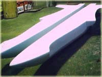 Iniziamo con la descrizione tecnica costruttiva del nostro modello. Una volta scaricati e stampati su carta da una copisteria i profili della : fusoliera, ali, alettoni, calotta, deriva, ecc. ritagliamoli e poggiamoli sulla nostra lastra di polistirene; con una penna tracciamo il bordo in modo da riportare il disegno sull' epp sia per il lato sx che dx, perchè successivamente verranno unite. Nessuno ci vieta di fare tutto doppio da ottenere un modello di scorta per qualsiasi evenienza :-) Tagliamo come in figura con un seghetto o con un cutter affilato i profili del modello mantenendoci con un margine di un centimetro circa di abbondanza dal bordo per sicurezza; ottenute le parti grezze che compongono il modello le rifiniamo a misura con un tampone di legno rivestito con della carta vetrata, e andremo a segnare i riferimenti di taglio anche sulla parte appena tagliata. |