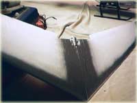 Per quanto riguarda gli alettonili ricaveremo da una lastra di balsa lunga 55 cm dove un lato alto 25cm e uno 45cm, anch' essi verniciati e ricoperti con del nastro trasparente che fara' anche da cerniera infatti risulta un ottima soluzione e funzionale, Sui lati per maggior stabilita occorranno due Winglets che ricaveremo da un pezzo di balsa alto 13 cm con un lato da 13 e uno da 3, ricoperti con del nastro anch' essi, li andremmo ad avvitare con 2 piccole ma lunghe viti parker direttamente sul polistirolo. Sulla parte inferiore come vedete in foto ho fatto un tamponcino sempre in espanso utile per la presa nel momento del lancio |